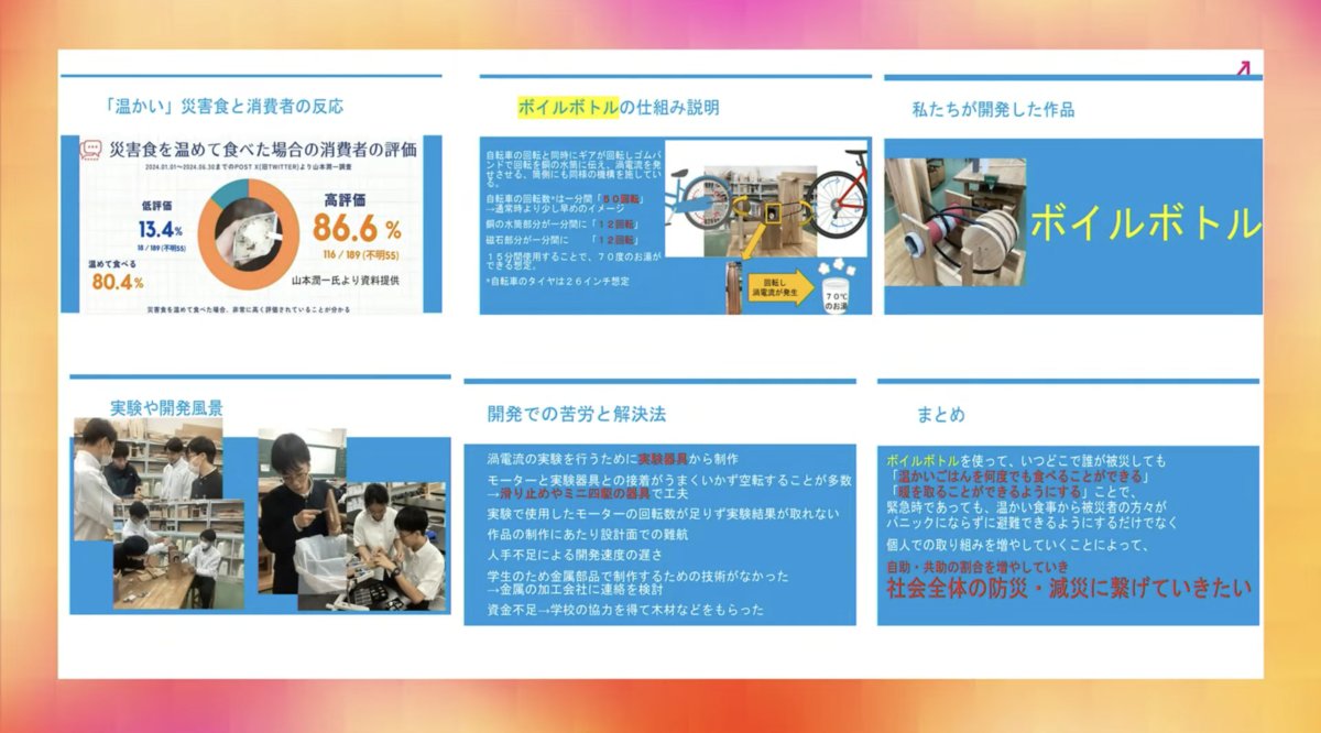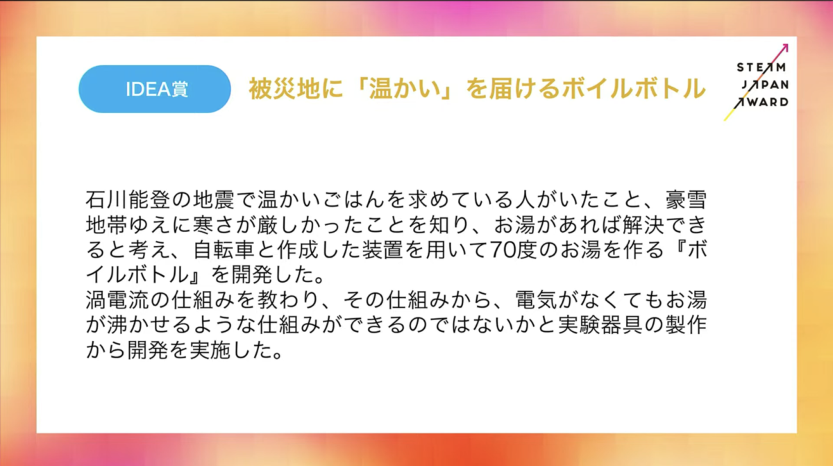 もともと学校の探究の時間で、起業家教育の起業プランとして作ったのがボイルボトルでした。その中で、チームで渦電流の研究や開発の研究をかなり頑張ったので、研究発表作品としてもどこかで発表したいという思いから、発表の場を探していた時に、親からSTEAM JAPAN AWARDを教えてもらい、応募しました。