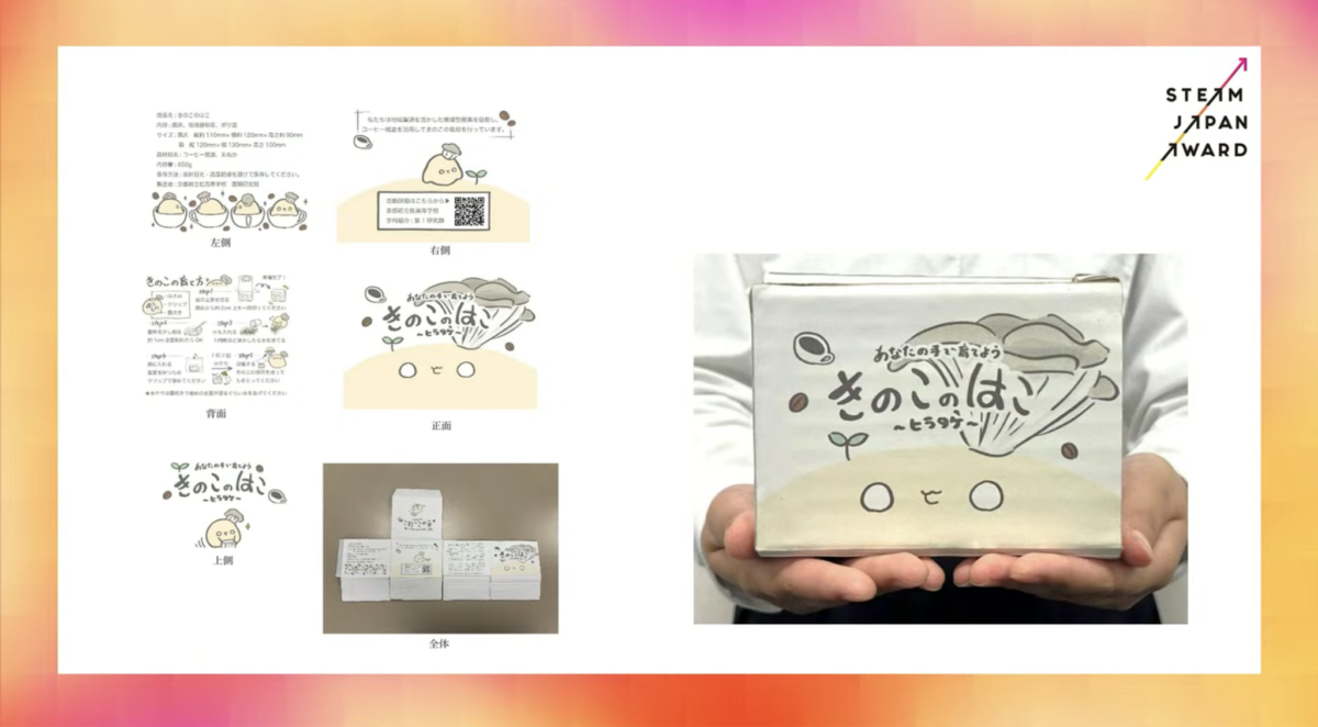 特にきのこのはこのパッケージを工夫しました。きのこのはこは家庭でコーヒー残渣からきのこを収穫する体験を通じて食育や環境教育を提供するために作成しました。ターゲットが小中学生のため、親しみを持ちやすいかわいらしく、わかりやすい製品になるよう工夫しました。具体的にはパッケージにきのこのオリジナルキャラクターを配置し、名前もひらがなで「きのこのはこ」と命名しました。