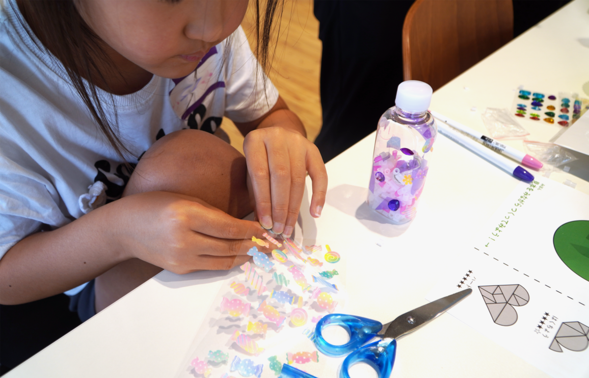 透明の容器にビーズやラメを入れたり、シールやペンで模様を描いたりと、子どもたちは細部まで工夫を凝らし、自分だけのオリジナルマラカスを仕上げていました。