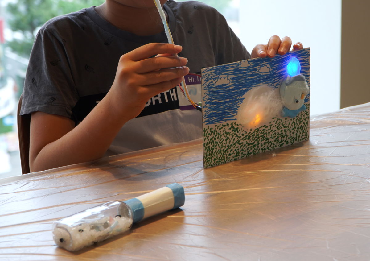 ろうそくの火を光らせたり、わたあめをレインボーに光らせたりと、発想はまさに十人十色。LEDの配置や配線に苦戦しながらも、試行錯誤を繰り返して作品を完成させたときの子どもたちの笑顔はとても輝いていました。つくる楽しさと同時に、アイデアが形になる達成感を味わうことができました。