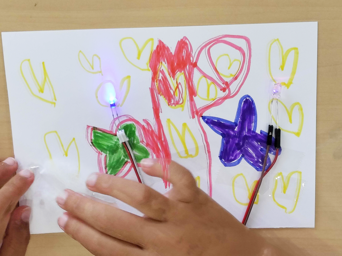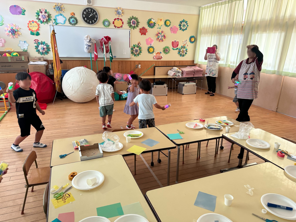 6月に行われたSPARK!体験会。法輪保育園では、ペットボトルとLEDモジュールを使った「光るキラキラボトル」を制作。完成したボトルを手にした子どもたちは、音楽に合わせて元気いっぱいに踊り出しました。