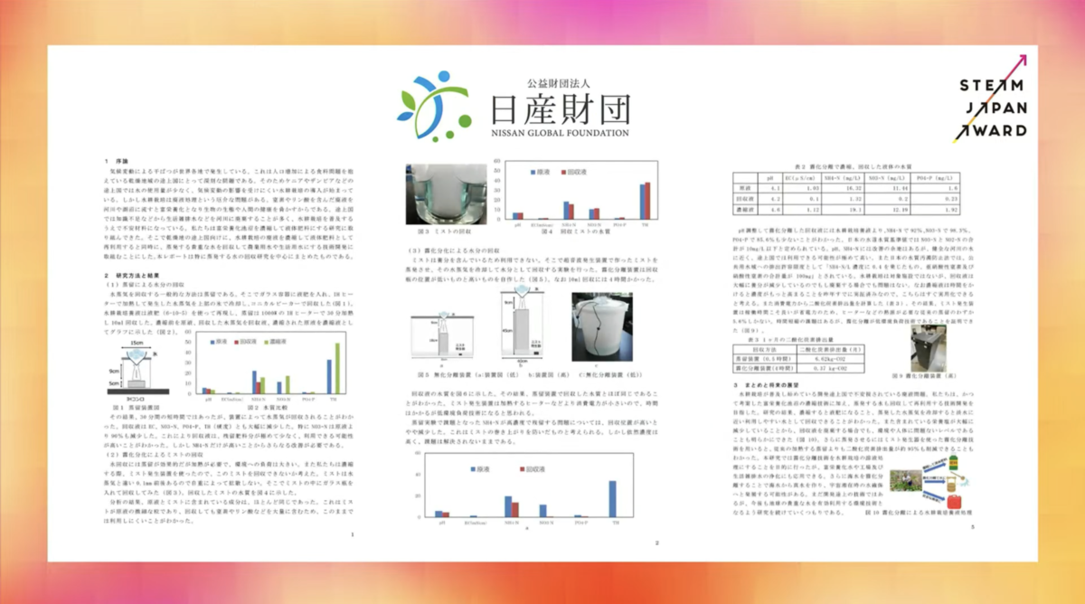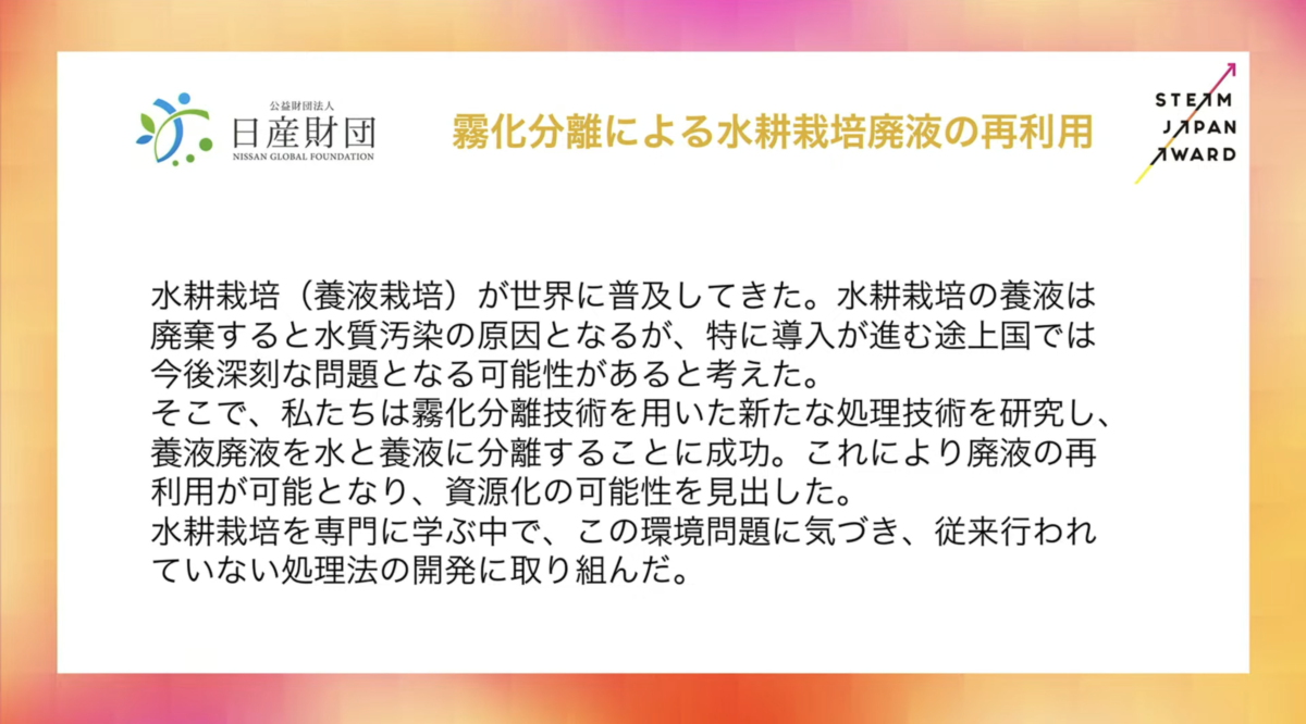 日産財団賞のような大きな賞をいただけたこと、本当に嬉しく思っています。ありがとうございます!昨年から取り組んできた研究が、霧化分離の技術として初めてこのような場で評価いただけるとは思っていなかったので、とても驚きました。 きっかけは、学校の授業で行っている水耕栽培で、廃液がそのまま排水溝に流されているのを見たことです。環境汚染につながるのではないかと考えた結果、霧化分離という方向に行き着きました。